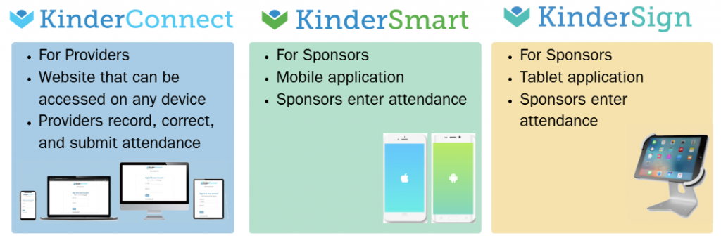 Daily attendance tracking is required in order for you to receive payment. Sponsors are responsible for recording attendance; this is not the provider’s responsibility. Sponsors must use either KinderSign (tablet-based) or KinderSmart (mobile app) to check their child in and out each day. They may choose the option that works best for them or use both.